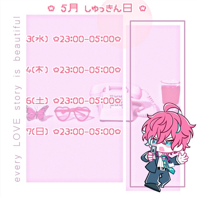 のえ@エルヴィス@No_Elvis515·5月始まるぞー! とりあえず来週の出勤予定になりますん 何卒~!!!!4