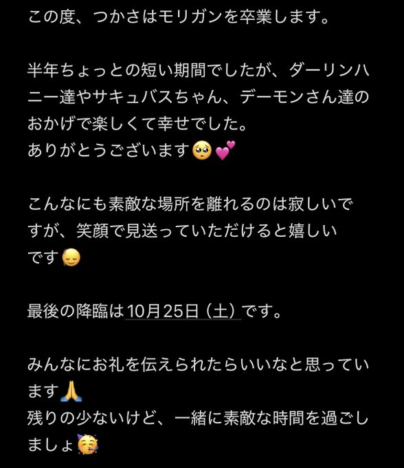 つかさ💜サキュバスシーシャバーMORRIGAN@tks_morrigan·10月15日ェ引用サキュバス シーシャBAR TAILS名古屋店💜@Succubus_Tails·10月14日ハンちゃんの降臨が最終日です😭 お席たくさんなので門出を祝いに来てください㊗️🎉 ご堕落お待ちしております👋210