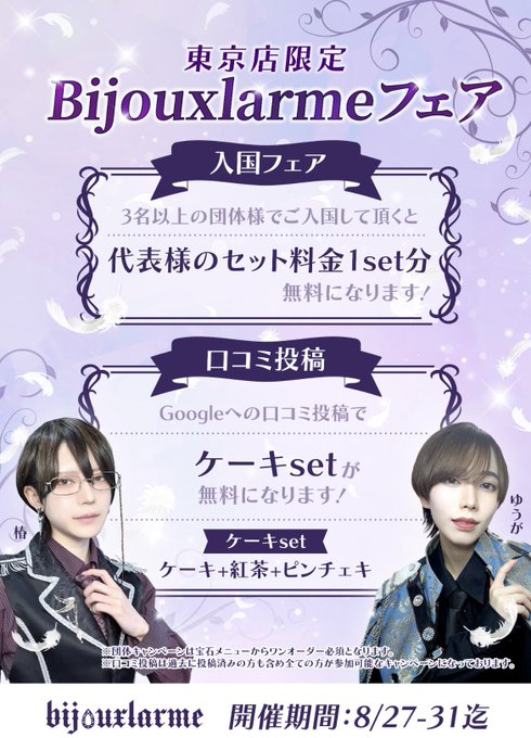 とあ🍡@ビジュラム東京@bjlmakb_toa·8月26日お得なフェアー!!!!引用ビジュラム東京店┃秋葉原💎男装コンカフェ@bjlm_akiba·8月26日‧✧̣̥̇‧✦東京店限定Bijouxlarmeフェア✦‧✧̣̥̇‧ 団体様のご入国により代表者様がお得になるキャンペーンを開催いたします❕ 期間中口コミを投稿して頂くことでお得なケーキset🍰も貰えるので是非ビジュラムにお越し下さいませ💎 開催期間:2025/08/27-31 開催場所:ビジュラム東京店2229