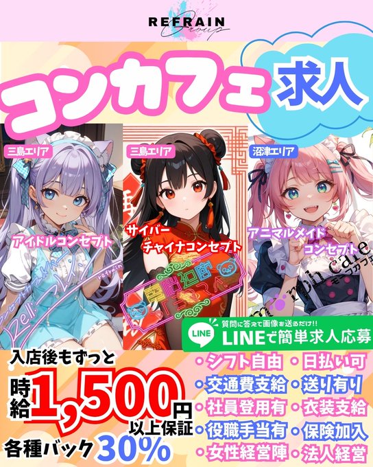 三島⛩コンセプトカフェ&バー 『Re:フレイン』@Refrain_mishima·🟩LINEで簡単応募🟩 🎀コンカフェ嬢募集中🎀 _________________________ 三島エリア2店舗、沼津エリア1店舗でキャスト募集いたします✨未経験者OK🔰在籍キャストの8割が未経験スタートです❣️まずは公式ラインで募集要項だけでも確認してみてくださいね🩵 ⬇️ご応募はこちらから⬇️さらに表示5480