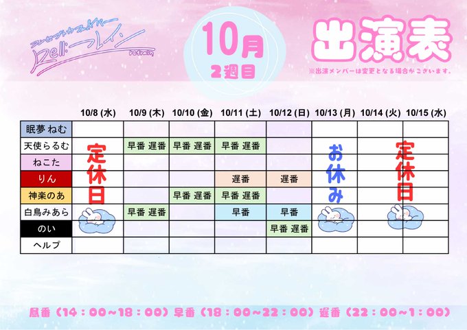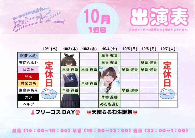 固定三島⛩コンセプトカフェ&バー 『Re:フレイン』@Refrain_mishima·⭐️10月の出勤表です⭐️ 10/4(土)「天使の日」は @refrain_llarumu 生誕祭🎂当日24時ちょうどにお酒解禁となります🥂記念すべき20の誕生日をぜひお祝いにいらしてください✨19:00オープンとなりますのでご注意ください🙇♀️さらに表示2132,040