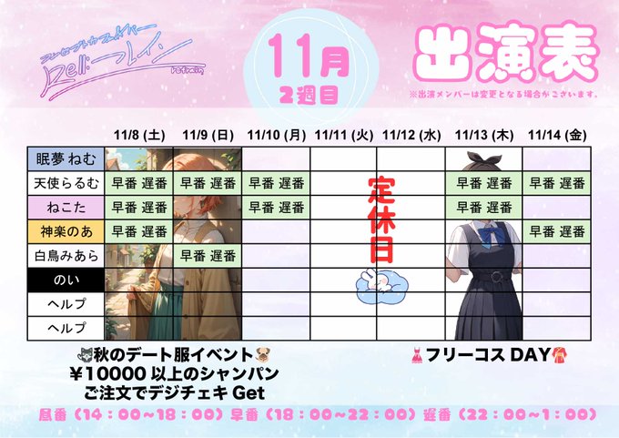 固定三島⛩コンセプトカフェ&バー 『Re:フレイン』@Refrain_mishima·【📅11月の出演表公開📅】 10月は多くのオタクさんにご来店いただきありがとうございました❣️今月も楽しいイベント盛りだくさんなのでぜひ楽しんで下さいね✨さらに表示91,217