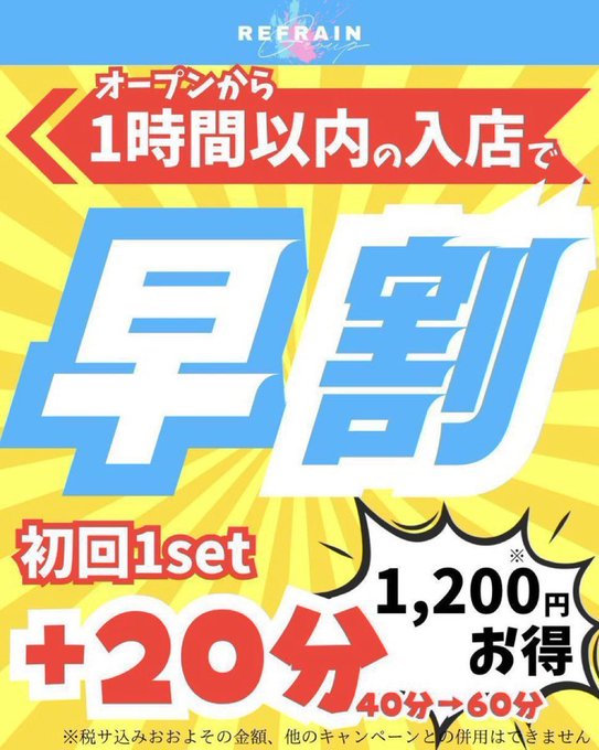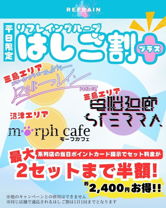 三島⛩コンセプトカフェ&バー 『Re:フレイン』@Refrain_mishima·🌟平日限定早割り・はしご割適用です🎀 (最初の1時間以内の来店で1set 40分→60分っ!!🫧🪽)3143