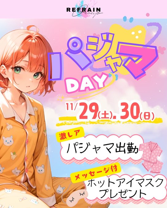 三島⛩コンセプトカフェ&バー 『Re:フレイン』@Refrain_mishima·/ 🛌11/29(土)&30(日)はパジャマDAY🛌 \ 当日は貴重なパジャマ出勤となります💤 来場特典はアイドルちゃんたちの手書きメッセージ付きホットアイマスクをプレゼント❣️ ぜひ遊びにきてくださいね✨ #静岡コンカフェ #コンカフェ #三島コンカフェ6301