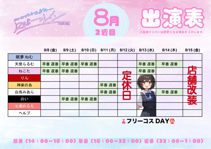 固定三島⛩コンセプトカフェ&バー 『Re:フレイン』@Refrain_mishima·\\8月の出演情報です✨// 16日(土)と17日(日)は三嶋大祭に合わせてお昼から営業いたします❣️さらに浴衣出勤&屋台持ち込み可となります⭐️⛩️👘 店内カウンター改修のため何日かお休みもいただきます🙇♀️より居心地の良いカウンターになる予定です‼️ #コンカフェ #静岡コンカフェ #三島2142,500