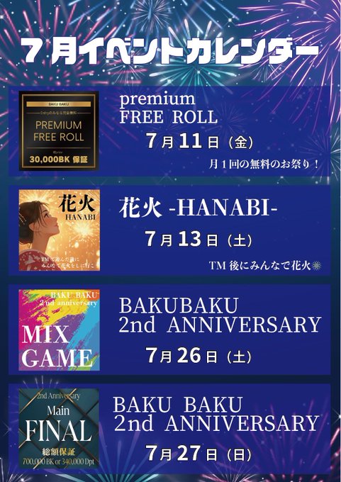 固定Amusement poker「BAKU♠︎BAKU」@poker_BAKUBAKU·🧡💛7月イベントカレンダー💛🧡 11日(金) PREMIUM FREE ROLL ▶ 完全無料のTM🔥 是非ご参加ください✨ http://pokerfans.jp/events/1566722 13日(土) 花火 - HANABI - ▶ TMの後にみんなで花火🎆 夏を楽しもう🌻 http://pokerfans.jp/events/1568624 26日(土) BAKUBAKU 27日(日)さらに表示311,870