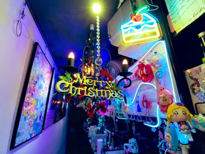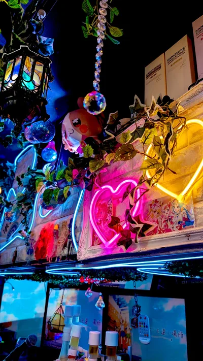 アイドルアニメのステージや魔法少女の変身バンクのように光る可愛い店内を目指して装飾中です!今回はカウンター上にハートのカラフルなライトをつけてみました!かわいいと評判です❤︎