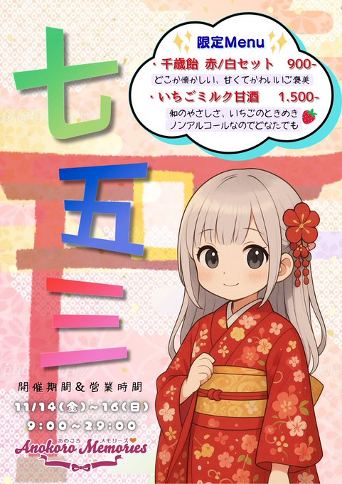 固定あの🎀メモ AnokoroMemories 西池袋店@anomemo_ikb·こんにちはあのころメモリーズです🎀 最近すっかり寒くなってきて、冬を実感しますね⛄ しかーし❣あのメモは超ホットです!🔥 明日から新イベント「七五三イベント」開催です🎉 限定メニューの ・千歳飴 ・甘酒 はあの頃を思い出させてくれる、まさにピッタリなメニューですね💖 開催期間はさらに表示1472