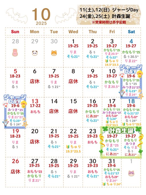 固定🍃Leaf change(リーフチェンジ) 🦊🦊🦊🦊4年目突入@Leaf_change1224·10月の出勤表です🍃 🍀︎🍀叶森生誕イベント🍀︎🍀 10/24(金),25(土) 他にも、 期間限定⁉️”おもちちゃん“や“体験入店”など盛りだくさんです🍡🔰 後半もたくさんの人間様のご来店をお待ちしております🦊💞 ‼️‼️‼️キャスト募集中‼️‼️‼️54714