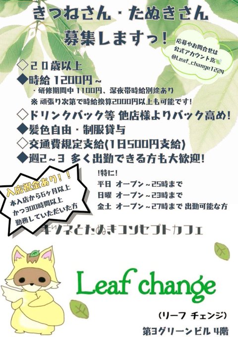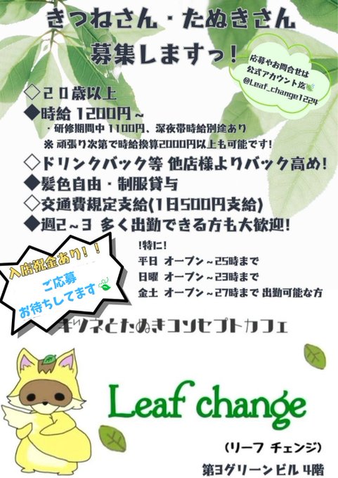 🍃Leaf change(リーフチェンジ) 🦊🦊🦊🦊4年目突入@Leaf_change1224·本日 20(月) 《《 店休 》》です! 明日 21(火)お待ちしてます🍃 ※公式TikTok始めました! 🍃Leaf change(リーフチェンジ)🦊をチェックしよう! https://tiktok.com/@leaf_change1224?_t=ZS-90hWSlWTNA8&_r=1… ※求人募集中 ※ゲスト募集中 ※経験者1日体験も募集中 (雰囲気感じとって下さい)62436