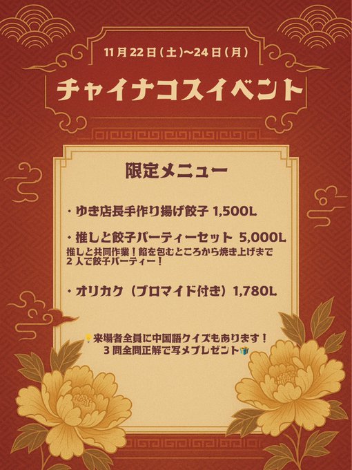 - 平日:18:00~23:00 土日祝:15:00~23:00