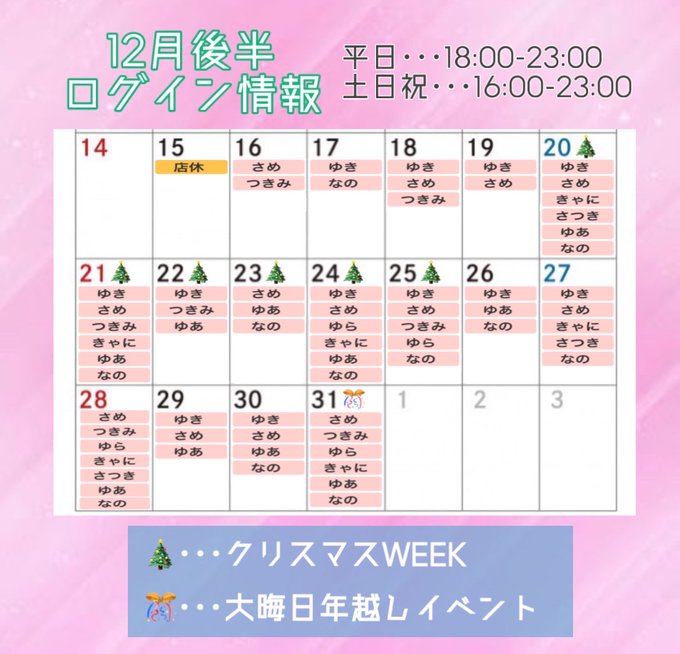 - 平日18~、土日祝17~25時(キャストの状況により23時閉店あり)