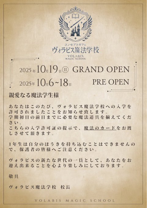 オープニングスタッフ募集中 ヴォラビス魔法学校@volabis_school·【🪄︎︎ヴォラビス魔法学校 開校✨】 ”10/19 グランドオープン💖” 待ちに待った魔法学校が開校!? ”10/6~10/18 プレオープン開催🌱” 新人魔法学生が魔法を使えるように頑張ります✨ ⬇️こちらの入学許可証の提示で魔法のカード(割引クーポン)プレゼント🎁︎💕︎18146