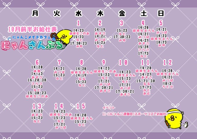 固定にゃんこメイドカフェにゃんさんぶる@nyankomaidcafe·10月前半お給仕表です❗️ 11-13にゃんこ運動会です😽👕1138