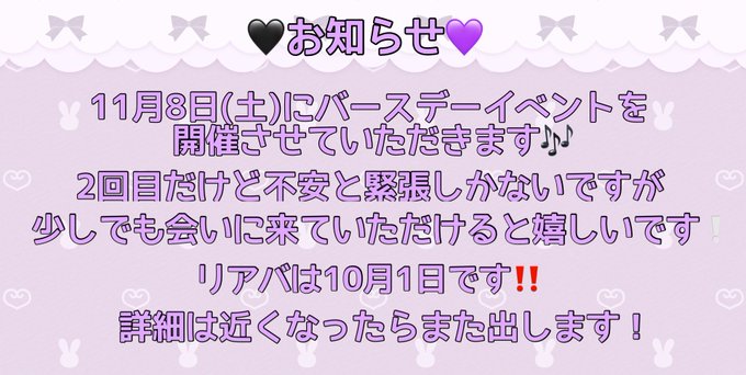 吉良みおナリさんがリポストあんにゃ@HAPISATA__ANNA_·🖤お知らせ💜 11/8にバースデーイベントを開催させていただきます‼️ リアバは10月なのですが仕事の都合で土曜日になかなか休みが取れなさそうで11月になりましたᐡ т · т ᐡ いつも会ってる人も久々の人もみんなお待ちしてますദ്ദി>ᴗ<)🎀✧9281,800