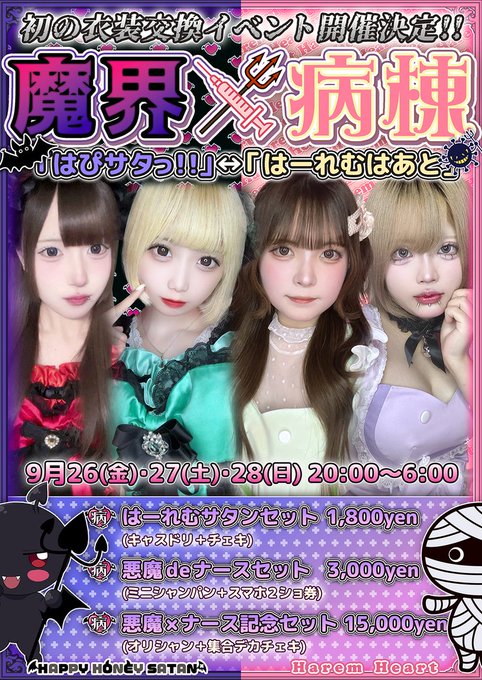 芥 ミケ@HAREM_mike·15時間ずっと前から大懇願してたイベントです ミケさん推しには絶対来て欲しい引用はぴサタ帯広店👿HAPPY HONEY SATAN👿帯広コンカフェ@HAPISATA_ob·9月21日━━━*\イベントのお知らせ/*━━━ 9/26(金)・27(土)・28(日) 衣装交換イベント 『魔界×病棟👿💉』 開催です‼️ イベント期間中は はぴサタの悪魔さんがはーれむに はーれむのナースさんがはぴサタに 出現します👿💉さらに表示9549
