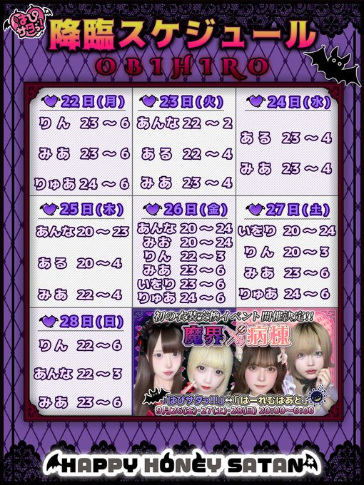 吉良みおナリさんがリポストはぴサタ帯広店👿HAPPY HONEY SATAN👿帯広コンカフェ@HAPISATA_ob·【9/23(月)~9/28(日)】 週間降臨表です! 9/26(金)・27(土)・28(日)は 衣装交換イベント 『魔界×病棟👿💉』 開催です‼️ イベント限定メニューを多数用意して たくさんの奴隷の皆様のご来店お待ちしております👿 #帯広 #コンカフェ #アルバイト募集36754