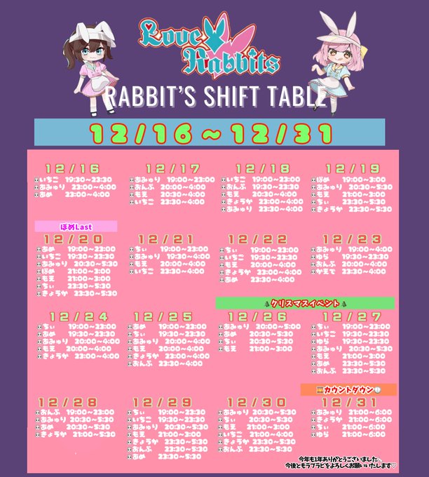 札幌・すすきの ラブラビッツ固定Love Rabbits(ラブラビッツ)札幌コンカフェ@loverabbits82·🎄12月後半お給仕表🕛 ❤️イベント💚 20▶︎ぽめLAST🐶 26.27▶︎クリスマスイベント🎄🎁 31▶︎カウントダウン🕛 営業時間 🐇平日 19:00~4:00(LO3:30) 🌙週末(金・土・祝前日) 19:00~5:30(LO5:00) ❤️🔥年末年始は6時営業です❤️🔥 ダイナー様のご来店お待ちしてます❣️13203
