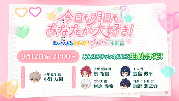 あぽろ♥︎くりすたる@apqoro·4時間みなきゃ。引用あんさんぶるスターズ!!【公式】@ensemble_stars·6時間🕘いよいよ本日21時〜配信❗🕘 ─── ・ 。゚♡ 。゚. ─── #あんスタ10_5周年生配信 今日も明日も、 あなたが大好き! ─────────── 📺視聴はこちらから♪ https://youtube.com/live/7H0pgjNMJ7U… 📮お便りもお待ちしております! https://questant.jp/q/IMMOEZBT #あんスタ1161