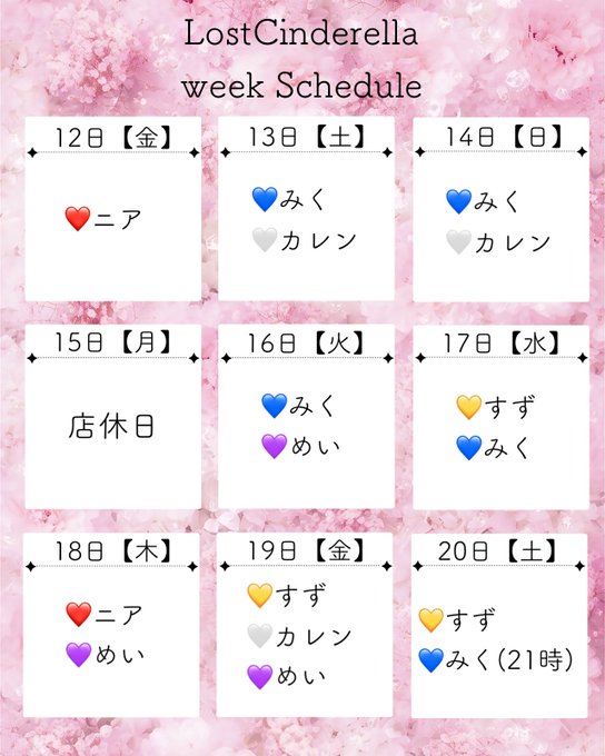 固定LostCinderella~コンセプトカフェ@LostCinderella0·《シフト》 12日(金)ニア❤️ 13日(土)みく💙カレン🤍 14日(日)みく💙カレン🤍 15日(月)店休日 16日(火)みく💙めい💜 17日(水)すず💛みく💙 18日(木)ニア❤️めい💜 19日(金)すず💛カレン🤍めい💜 20日(土)すず💛みく(21時)💙 21日(日)店休日 ⚠️本日のシフトが変更になっております11633