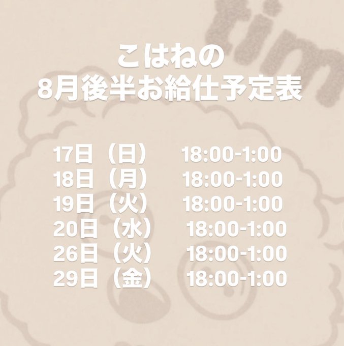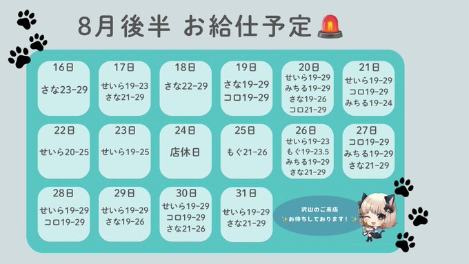 固定あにぽり札幌 🐾シーシャコンカフェ🐾@anipori_sapporo·🐱8月後半 お給仕予定表 🐾 お待たせ致しました❕ 8月後半もよろしくお願いいたします🤍8152