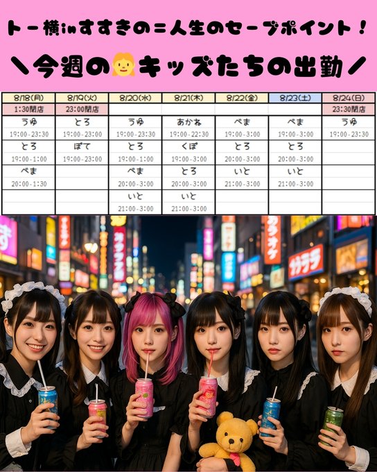 固定札幌コンカフェ『トー横inすすきの』@toyoko_ssk·👧最新のキッズ出勤スケジュール👧 🚨トー横 in すすきの🚨 そこはただの遊び場じゃない。 毎夜集結するのは、強烈な個性と異能を持つキッズたち👧 🍌バナナで敵を制圧するサバイバルキッズ 🛸3秒ごとにUFOと交信する宇宙キッズ 🐙タコ焼きソースで未来を予言する少女さらに表示1191,395