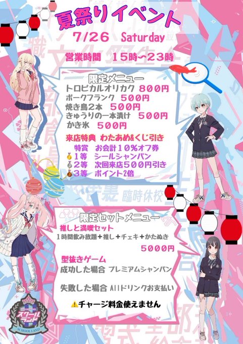 もえぎ@スクールランド@moe_schoolland·今週のおきゅ❣️ 26日は夏祭りイベント開催だよ〜 夏って感じでわくわくするね🎶 限定メニュー食べに来て🤤🤤 写真はさいきんのコスです ルカ姉さんやってたの〜558