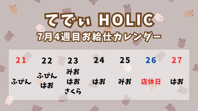 固定てでぃ HOLIC@teddyholi·7月4週目のお給仕カレンダーです🧸56799