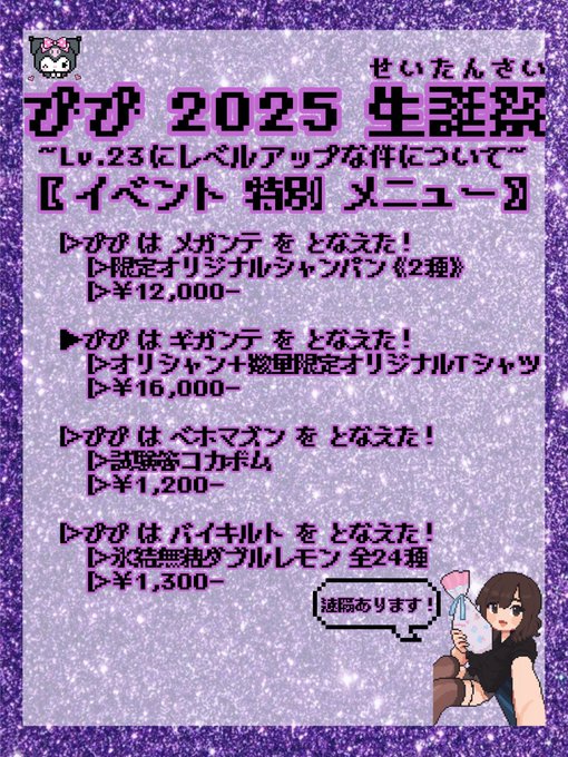 ぷいぷいみこち@mico_oishii·7月18日きょうはだいすきなぴぴたむのバースデーイベントです〰️😻😻わたしのかわりにみんないっぱい飲ませてつぶしてくだはい🎶🎶引用ぴぴ🎮@150cm_ore·7月8日꒰ঌ┈┈┈┈┈┈┈┈┈┈┈┈┈┈┈໒꒱ 🎮ぴぴ 2025生誕祭🎮 ~Lv.23にレベルアップな件について~ 7/18(Fri)・19(Sat) 生誕祭特別メニュー 多数用意! 特別衣装でおきゅいん! たくさんのお祝いお待ちしております! ꒰ঌ┈┈┈┈┈┈┈┈┈┈┈┈┈┈┈໒꒱15609
