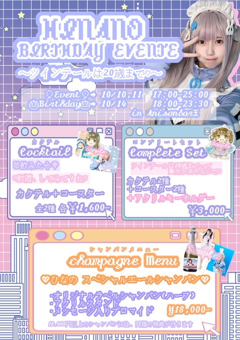 10/10㈮&11㈯ひなのBD@アニソンバーX札幌すすきのさんがリポストひなの💎アニソンバーX@hinano_anison·8時間よろしくお願いします💜 ̖́-引用10/10㈮&11㈯ひなのBD@アニソンバーX札幌すすきの@anisonbarX·9時間\🫧💜ひなの𝔹𝕚𝕣𝕥𝕙𝕕𝕒𝕪♡𝕞𝕖𝕟𝕦💜🫧/ 🎆オリジナルカクテル🎆 🩷可愛いイラストコースター2種類 💜アクリルキーホルダー付き 🎆オリジナルシャンパン🎆 💜アクスタ付きシャンパン 🩷ブロマイドにはメッセージ付きさらに表示0:116221,060