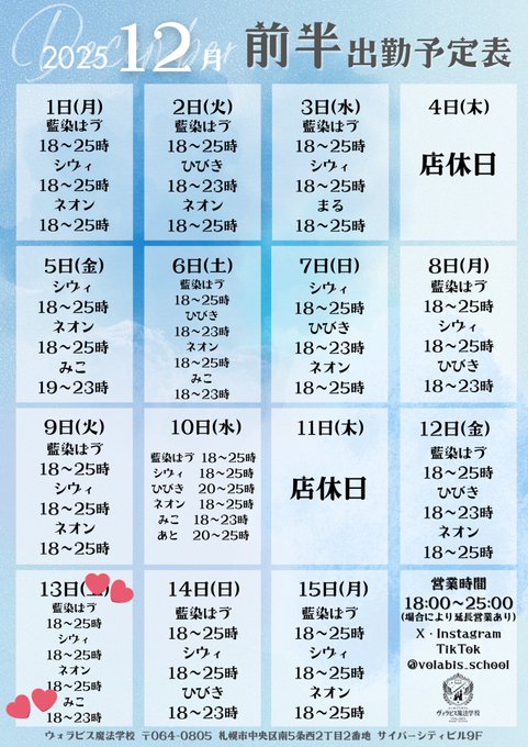 札幌・すすきの ヴォラビス魔法学校コンセプトカフェヴォラビス魔法学校@volabis_school·【ヴォラビス魔法学校オープン🪄︎︎✨】 👇12/13(土)魔法学生はこちら👇 藍染ばう 20:00〜25:00 @bavu_volabis シヴィ18:00~25:00 @syvi_volabis ネオン 20:00~25:00 @neon__volabis みこ 18:00~23:00 @miko_volabis TikTokLIVEもお見逃し無く✨ #ヴォラビス魔法学校 #札幌こんかふぇ26239