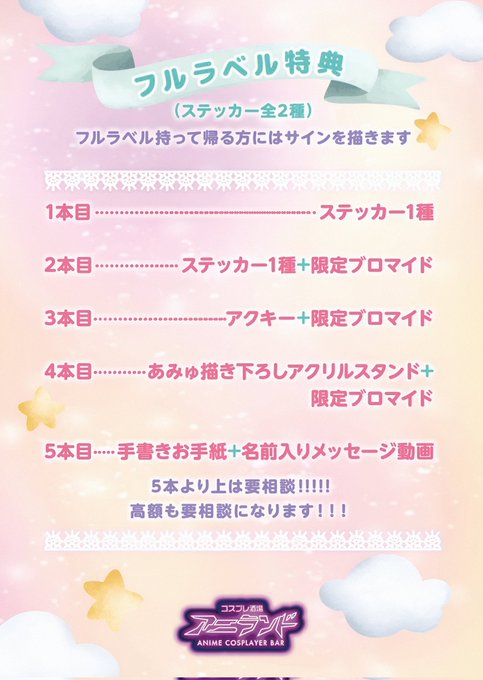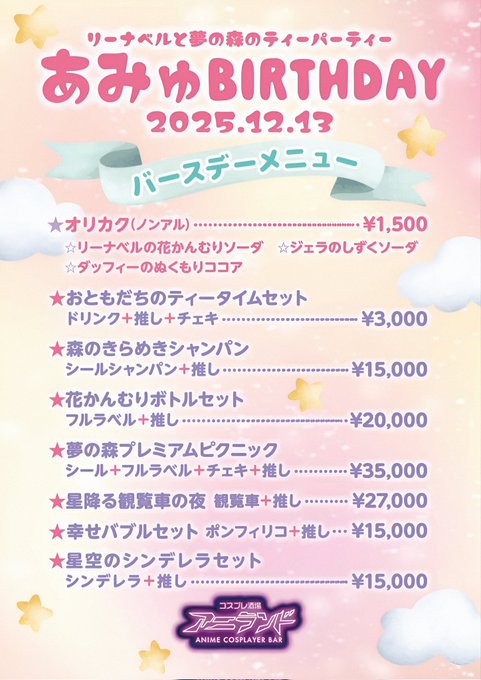 札幌・すすきの アニランドてとら@邪智暴虐@tetora_aniland·3分かわいいさんのお誕生日です世界でいちばん祝ってあげてください引用あみゅ@12/13BD@amyu_aniland_·10月21日バースデーイベントのメニュー表と フルラベル特典できました🦊🩷‼️ 当日はキャストみんなが 「ダ*フィ*フレiンiズ」の擬人化を して冒険者様たちをお待ちしてます!! ゆめかわで最高な1日になるはず‼️ フルラベルは予約制なので DMかリプで何本入れるかを教えていただきたいです! 詳しくは3枚目!1