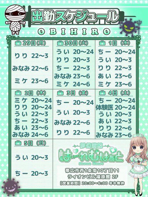 夢幻病棟『はーれむはぁと』❤帯広 コンカフェ 朝6時まで営業中~@Harem_Heart·本日10/4(土)は ◎開院時間:20:00〜6:00 となります🩺 🏥本日の勤務ナース 💗ちー @HAREM_chii 🔰体験医…休み 💗うい @HAREM_ui 💗あい @HAREM__ai 💗りり @HAREM_riri 💗みなみ @HAREM_minami 【Instagram】 ▶️http://instagram.com/harem.heart/ 【TikTok】 ➡️http://tiktok.com/@haremheartさらに表示11101