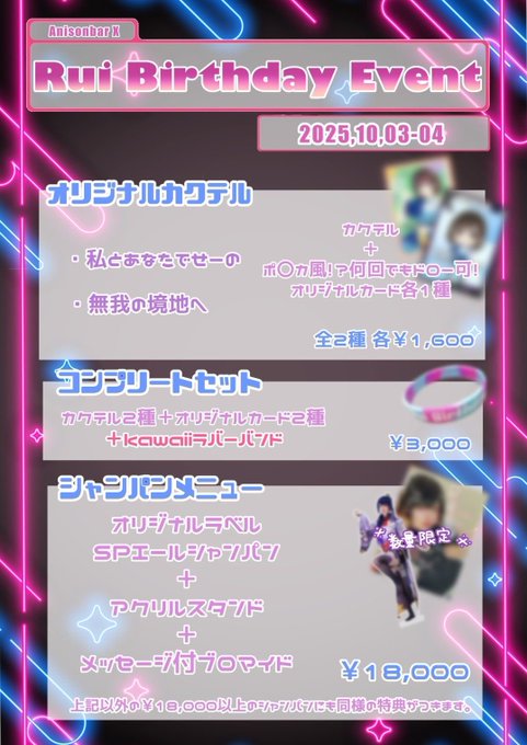 マジョリカ (札幌アニソンコンカフェ)@majori_ca·マジョリカオープンしました🌈 🌟 ありお 🌟 はる 🌟 ゆとり 🌟 あさひな 🌟 えま 🌟 てぃあら 🌟 やもり(20:00〜) 🌟 しい(20:30〜) 本日もラストまでお待ちしております🎤 🔽10/19-25 えまBirthdayウィーク&イベント🦋ありお@10/24・25🪭えまBDさんと他5人414744