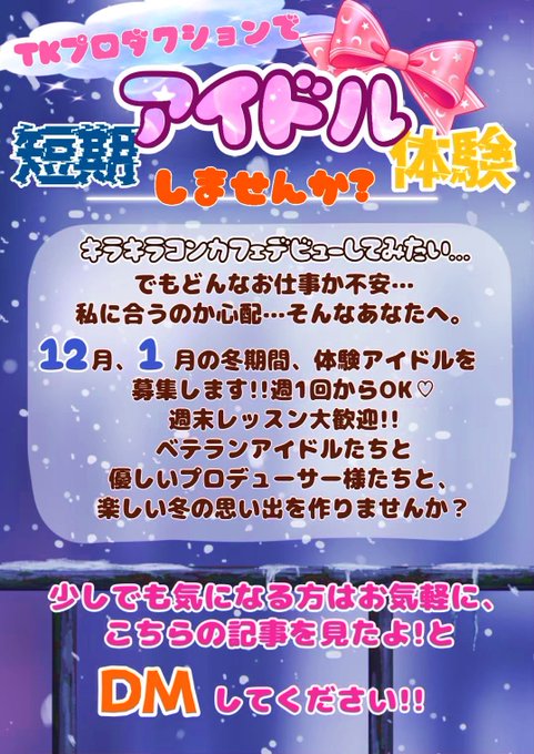 旭川・帯広 TKプロダクションアイドルコンカフェ TKプロダクション旭川店さんがリポストtakuya@matsudaALLURE1·年末年始プロダクションでアルバイトしてみたい人いませんか? 未経験の方も大歓迎です! 詳細はお気軽にお問い合わせください👌34417
