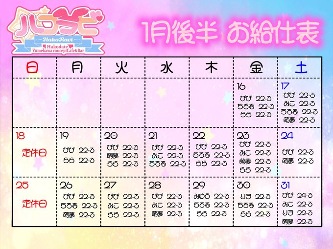 札幌・すすきの 【ハコラビ】函館Yumekawaコンセプトcafe&bar固定ハコラビ【函館Yumekawaコンセプトcafe&bar】@hakoravi·お待たせ致しました!🐰 1月後半のお給仕表が完成しました!✨ 詳しくは画像のカレンダーをご覧下さい。 1月後半もラビットちゃんがお待ちしてます🐰🥕🤍 #ハコラビ #函館 #コンカフェ2698