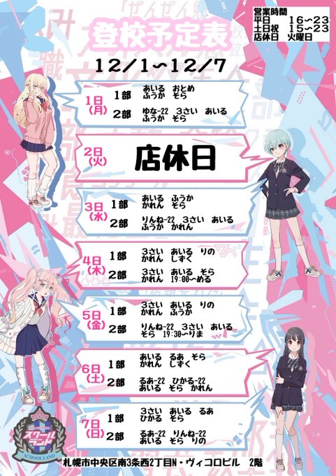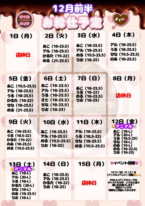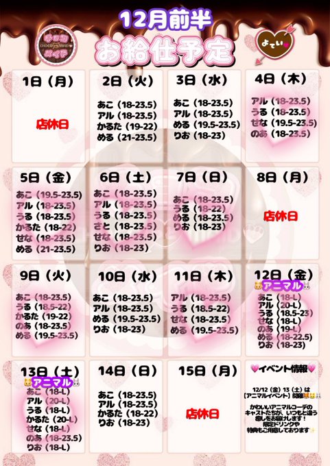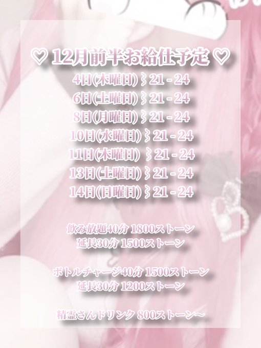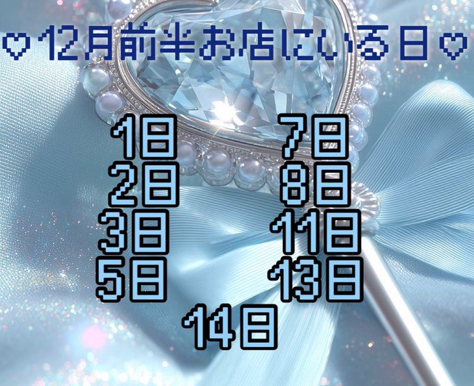 固定あすかデス@asuka_crystal·《♡12月前半お店にいる日♡》 沢山きてね🥺🩷 クリスマスもぼっち嫌だから出勤するつもり、、!! #琴似 #コンカフェ #ガルバ379