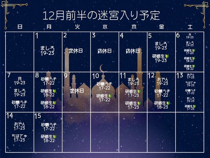 アラビアンコンセプトカフェ【ラビリンス】@札幌すすきの@labyrinth_cafe·【ラビリンス】 12月前半の踊り子スケジュールです🔮💫✨ 研修生たくさん🔰‼️✨ 何卒よろしくお願いいたします🌟15258