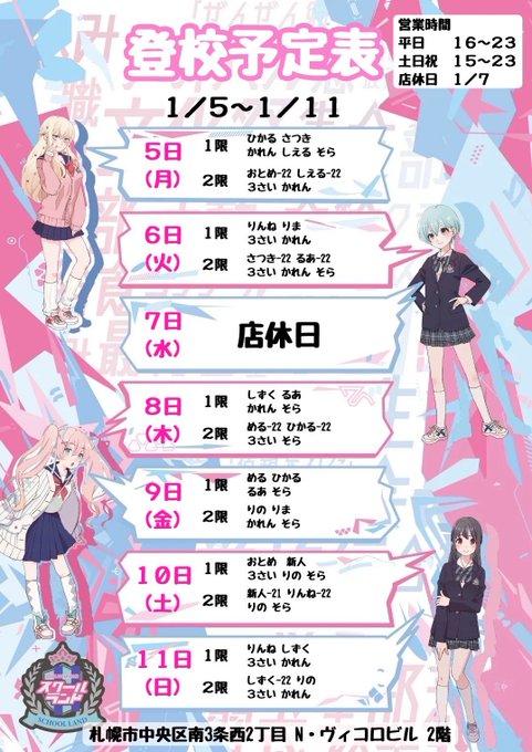 札幌・すすきの スクールランドコスプレ酒場スクールランド@schoolland_·2時間🏫本日1月11日(日曜日) 📛15時オープン✨(~23時まで) 📕1限 15:00〜19:00 📘2限 19:00~23:00 登校予定表と月間予定表はこちら↓↓↓引用コスプレ酒場スクールランド@schoolland_·1月10日🏫本日1月10日(土曜日) 📛15時オープン✨(~23時まで) 📕1限 15:00〜19:00 📘2限 19:00~23:00 登校予定表と月間予定表はこちら↓↓↓128