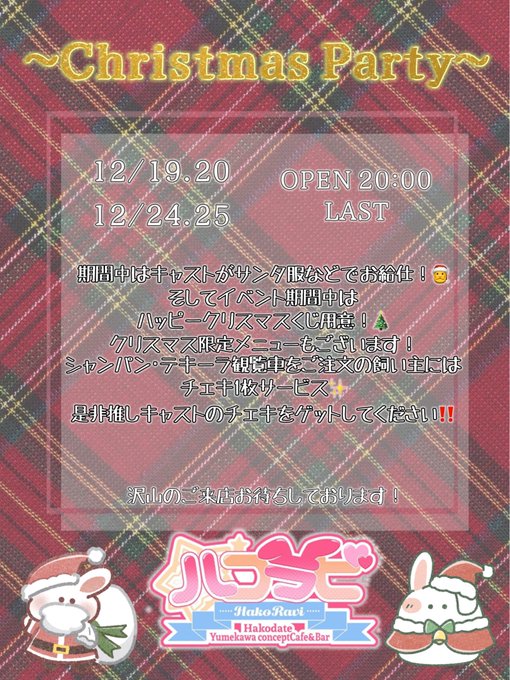 札幌・すすきの 【ハコラビ】函館Yumekawaコンセプトcafe&barハコラビ【函館Yumekawaコンセプトcafe&bar】@hakoravi·12月21日みこ おやすみになりました引用ハコラビ【函館Yumekawaコンセプトcafe&bar】@hakoravi·12月20日本日12/20のハコラビ🐇🎄 ・ぴぴ @150cm_ore ・みこ @mico_oishii (22:00~) ・みゆう @miyuu_hkrv (22:00~) ・リヲ @rio_hkrv ・ちろる @kokoko_hkrv (予約) クリスマスイベント2日目です! 20:00〜ᐢ.ˬ.ᐢ ♡✨ #函館 #ハコラビ #コンカフェ #函館コンカフェ296