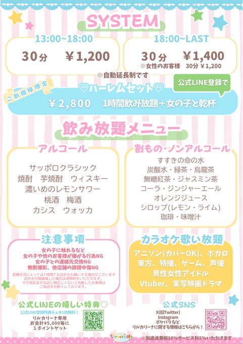 札幌・すすきの アニメコスプレバー リルカリーナ 札幌リルカリーナ【札幌アニメコンカフェ】@LircariNa·🗓️11月30日(日) ⏰営業時間 14:00-23:30⚠️ 👭本日のメンバー👭 はむ-18:00 たなか-21:00 りり15:00-19:00 りんご 18:00-23:30 ライ19:00-23:30 はのん19:00-23:30 #札幌 #コンカフェ #アニメコスプレ #アニメコンカフェ7423