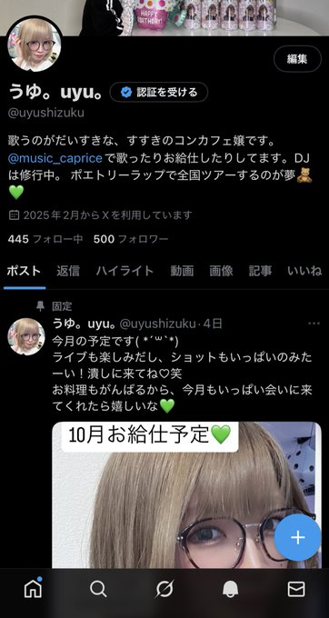 固定つばき@Tsu_camellia_oO·8時間10月のお給仕表なるものをポン バーイベが迫ってきているので頑張りますよ💪 まだまだオリジナルシャンパンも受け付けさせていただいております🥂 20歳のお誕生日お祝いしてください〜!引用つばき@Tsu_camellia_oO·9月29日【告知】 来たる11月4日はつばきの誕生日〜🎶 そしてなんと11月8日(土曜日)にバースデーイベントを開催させていただくことになりました!🎈 併せてオリジナルシャンパンも作らせていただきます!凄い! ご予約は発注の関係で23日までとなります! 店頭でもDMでもご予約受け付けております!何卒!🍒18347