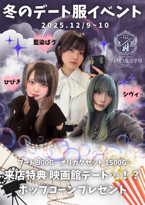 札幌・すすきの ヴォラビス魔法学校藍染ばゔさんがリポストコンセプトカフェヴォラビス魔法学校@volabis_school·”🚨ゲリライベント襲来!!” 2025.12/9~10♡ 服のデート服イベント開催🥟✨ あったかメニューやセットでお得に楽しもう✨ 来校でポップコーンプレゼント🍿🌟 まるで映画館デート…💖 たくさんの生徒さんをお待ちしております! #すすきの #コンカフェ #サイバーシティビル9F614630