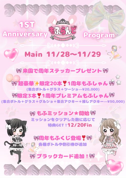 旭川・帯広 もふらんどおすず🐰もふらんど🎀@mofuland_suzu·11月27日私は『29日 20-23時』でいます🎀 プレもふしゃんは数に限りがあるので、 開ける予定ある人はえんちょーまで!引用あにまるコンカフェ【もふらんど🐾】帯広@animal_mofuland·11月16日【🎀もふらんど🐾】 \🎉1st Anniversary🩷イベント🎉/ 今まで来園くださったお友達の皆様へ 感謝を込めて🫶´- 超お🉐企画や✨この周年でしか 手に入らないグッズやメニューもご用意 しておりますっ🍾🥂 皆様のご来園を心より お待ちしております🎀 #コンカフェ #帯広 #もふらんど12184