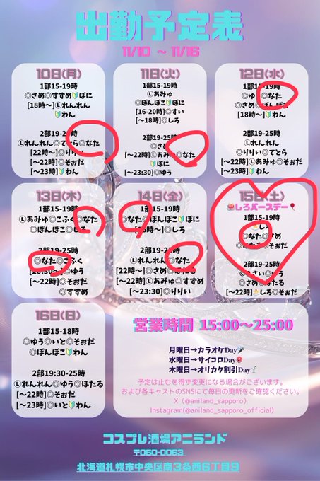 まゆしぃ@mayushiicaprice·15時間今日います🥰引用MUSIC CAFE&BAR CAPRICE(カプリス)@music_caprice·17時間🗓️11月10日(月曜日) 🕒18:00〜ラスト 👧本日の営業は21:00までとさせていただきます🍰 🍬まゆしぃ18-21 @mayushiicaprice 🍬らら18-21 @rara_caprice 🍬るる18-21 @Lulu_capurice 🍬せねら18-21 @Senera_caprice 札幌市中央区南7条西3丁目7青樹社ビルB1階11177