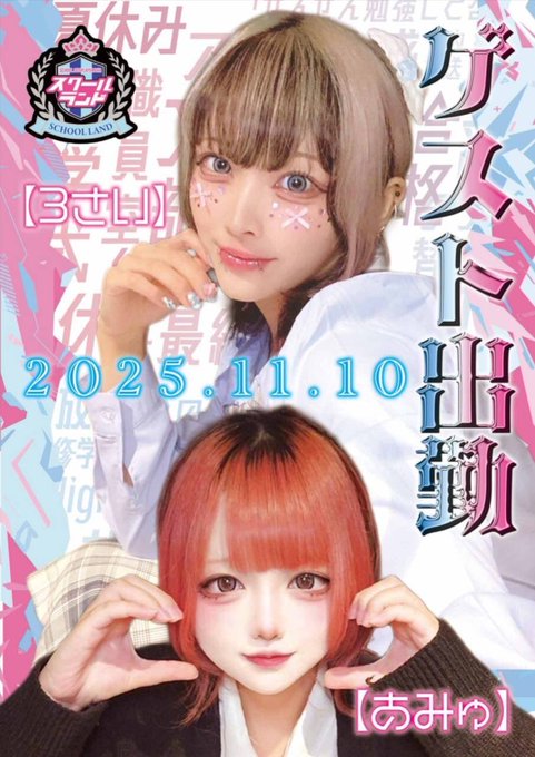 札幌・すすきの スクールランドしおんでした!さんがリポストコスプレ酒場スクールランド@schoolland_·📢11月10日(月) 🩷 アニランド 3さい&あみゅ 🩵 ✨スクールランドゲスト出勤決定!✨ #コンカフェ #札幌コンカフェ #すすきのコンカフェ #狸小路511812