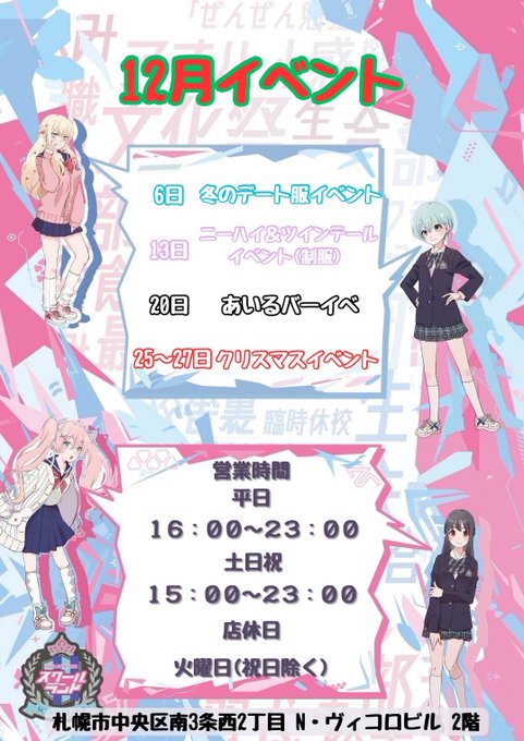 札幌・すすきの スクールランドコスプレ酒場スクールランド@schoolland_·🏫本日12月13日(土曜日) ︎💕︎本日ニーハイ&ツインテールDAY︎💕︎ 📛15時オープン✨(~23時まで) 📕1限 15:00〜19:00 📘2限 19:00~23:00 登校予定表と月間予定表はこちら↓↓↓5123