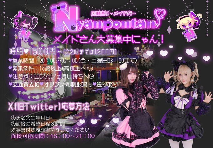 仙台にゃんこメイドバー💜Nyanpontan@bar_nyanpontan·💜メイドバーNyanpontan 💜 東北No1メイドカフェにゃんぽんたんの2号店 💜時給1500円~(22時まで1200円) 💜オリジナルの可愛いメイド服 💜送りあり 💜応募はDM、HPにて!お待ちしておりますにゃん🐈🐈81,128
