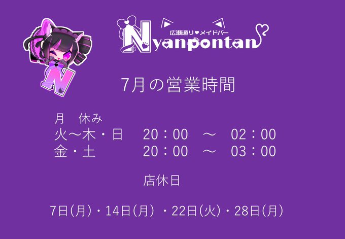 仙台にゃんこメイドバー💜Nyanpontan@bar_nyanpontan·本日のメイドちゃん はる まよ ねおん ぴむ まどろみ にこ もぴ ぴの みくる りこ ちゃい うちゃん ゆぺ 20時半~ たぬ 21時~ らり しゅな もぐ とおる はくろ 21時半~ みんと 22時~ なの 💜水曜日は26時までにゃ💜151,207