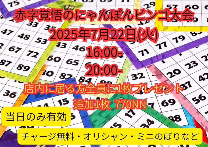 仙台にゃんこメイドカフェ♡にゃんぽんたん@tw_nyanpontan·😉赤字覚悟のにゃんぽんビンゴ大会😉 16:00~ 1等 チャージ無料券 2等 2名 ①にゃんカス セットリスト券 ②にゃあめろ セットリスト券 3等 のぼり※お好きなの1本 4等 数名 グッズ 20:00~ 1等 オリシャン(アルコールorノンアル) 2等 2名 ①にゃんカス 新曲選べる券 ②にゃあめろさらに表示14141,770